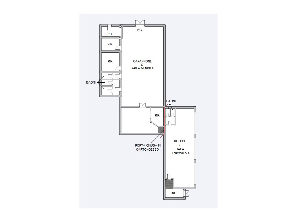 - Possibilità di locare in aggiunta altri 120 mq già comunicanti tramite una porta interna al momento chiusa con una parete in cartongesso, al prezzo aggiuntivo di 900€ + IVA al mese