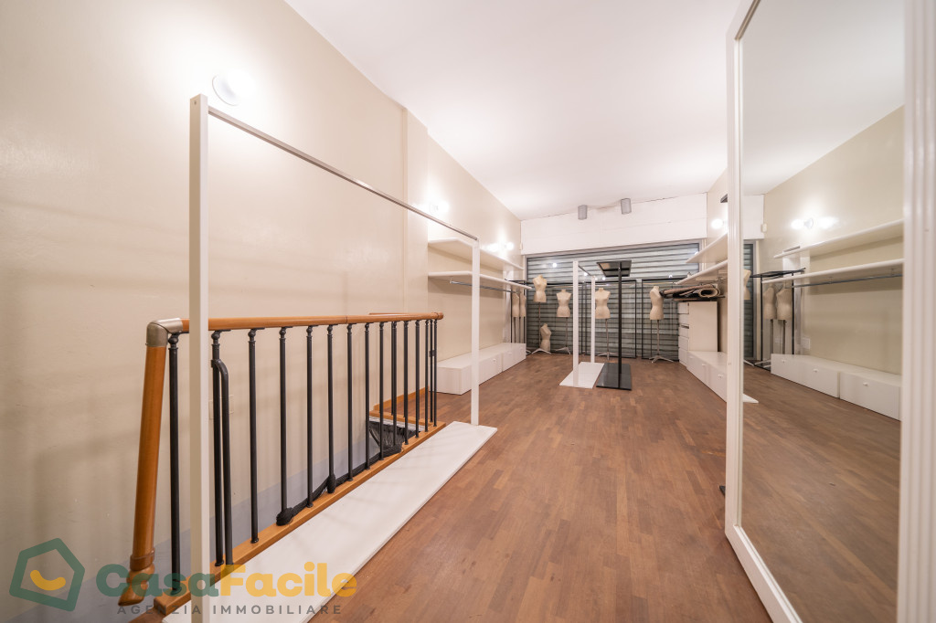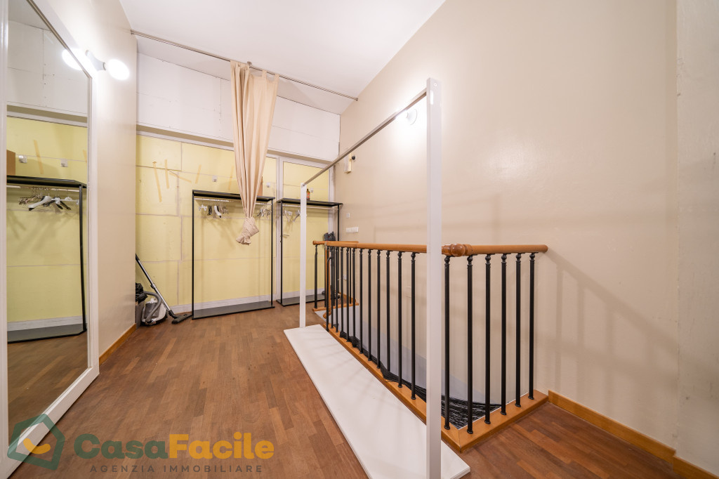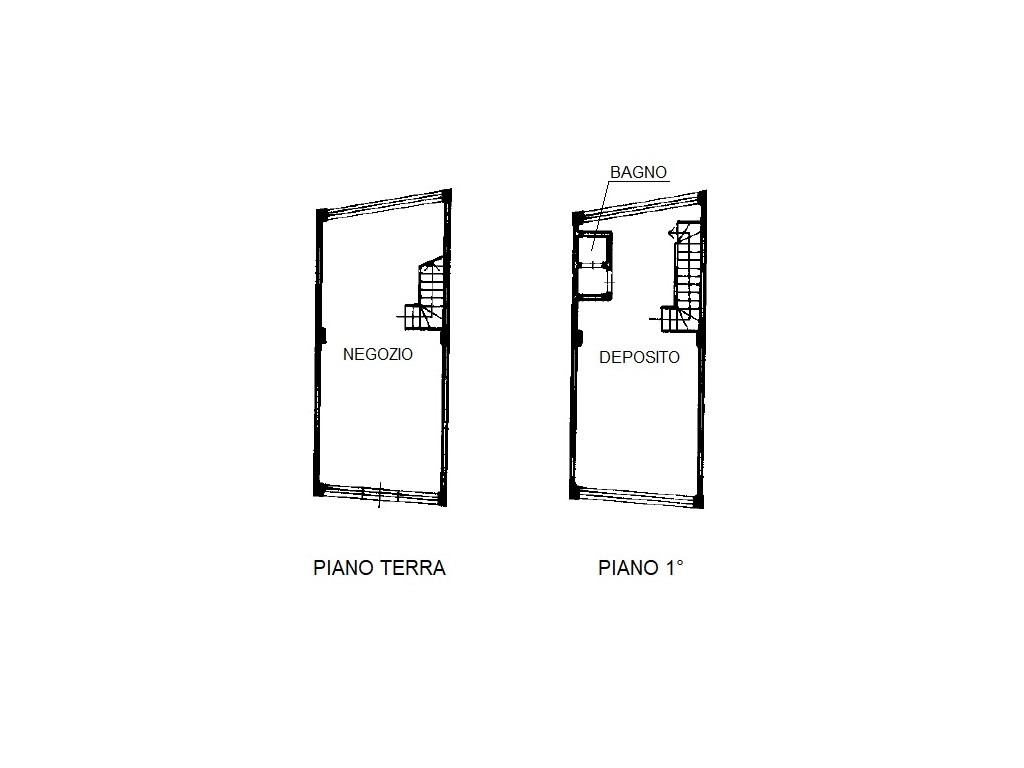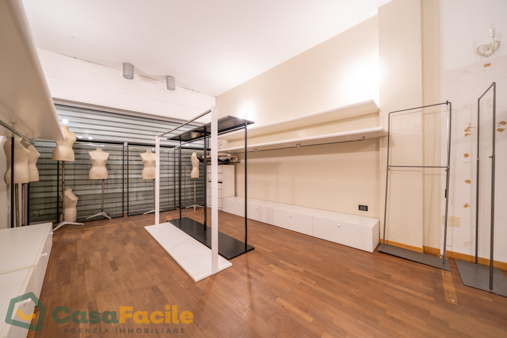 Al piano terra è presente l'area negozio con un'ampia vetrata. Tramite le scale interne giungiamo al piano primo dove troviamo il bagno di servizio e un comodo magazzino, anch'esso con vetrata esterna che affaccia su un piccolo portico di passaggio pedonale.