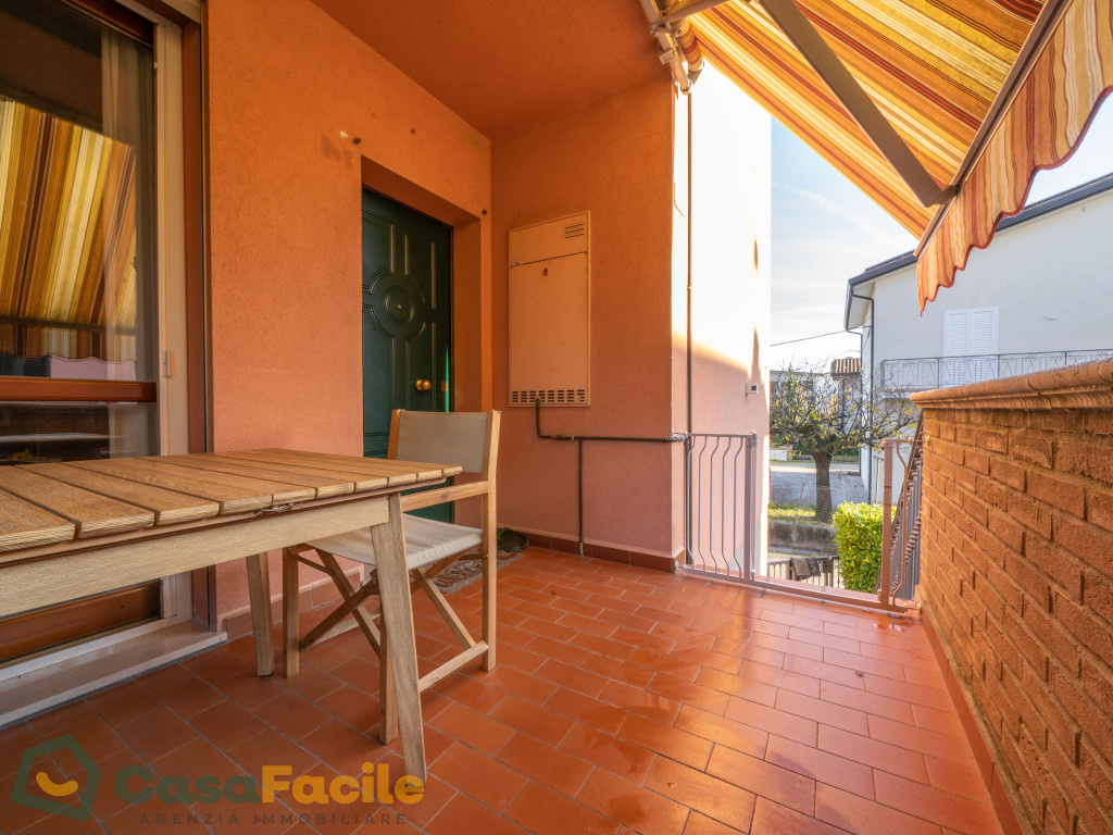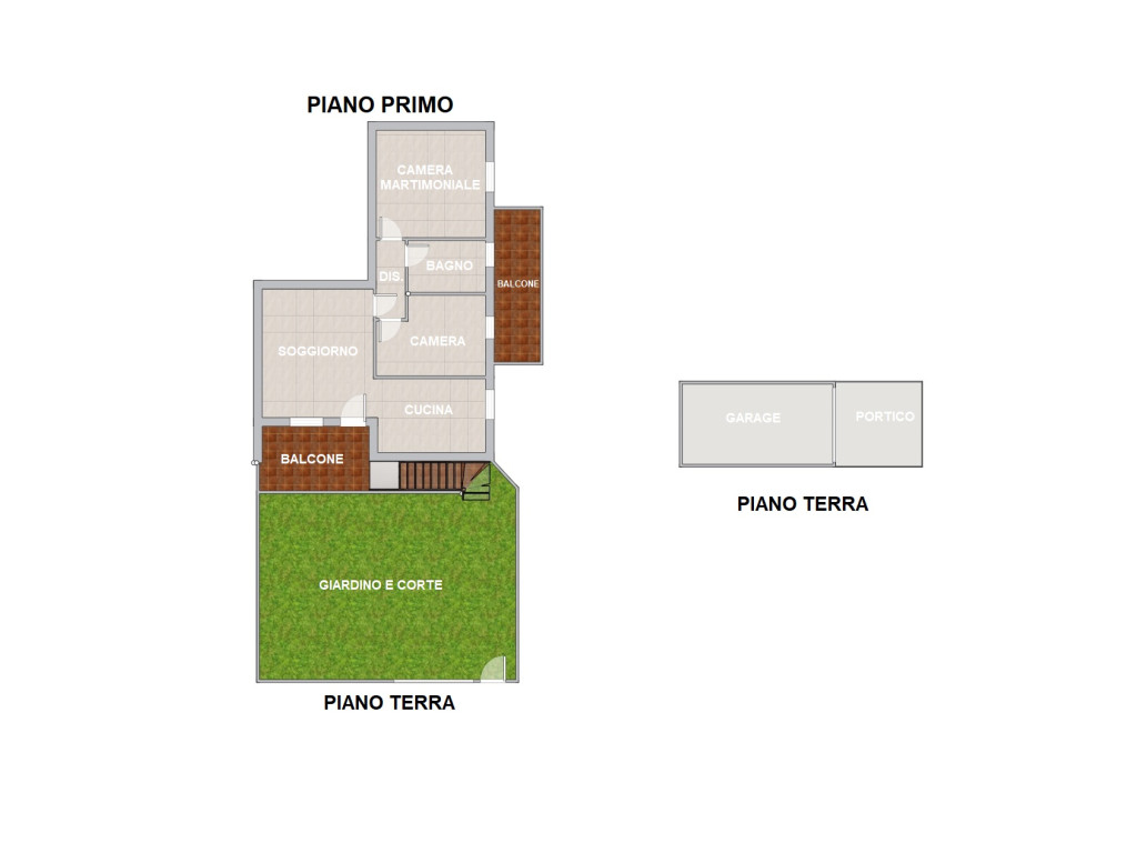 Dal giardino, salendo la scala esterna, si accede a un grande terrazzo abitabile, perfetto per pranzi e cene all’aperto. Entrando nell’abitazione troviamo il soggiorno con cucina a vista separata, disimpegno, una camera da letto matrimoniale, una camera singola con accesso a un ulteriore balcone, e un comodo bagno finestrato con box doccia.