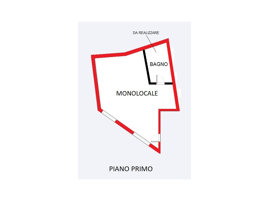 1) Euro 47.000 appartamento monolocale di 26 mq al piano primo (evidenziato in rosso nella planimetria), composto da un ambiente unico open space dove dovrà essere realizzato il bagno cieco (ad oggi non esistente).