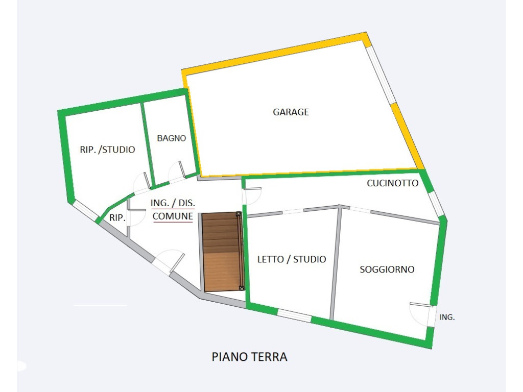 3) Euro 47.000 appartamento bilocale di 38 mq al piano terra con ingresso indipendente (evidenziato in verde nella planimetria), composto da soggiorno, disimpegno con angolo cottura e uno studio/piccola camera da letto singola. Sono presenti anche il bagno e un'altra stanza/ripostiglio, entrambi accessibili dall'ingresso comune con gli altri appartamenti. Per poter collegare il bagno con l'appartamento sarà necessario o acquistare anche il garage per poter creare un collegamento interno riducendo così il garage, oppure ridurre ulteriormente gli spazi abitativi e realizzarlo internamente.