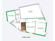 3) € 76.000 ampio garage di 20 mq + appartamento bilocale di 36 mq al piano terra (evidenziato in verde nella planimetria), composto da soggiorno, cucinotto, una camera da letto singola/studio, un ripostiglio e un bagno cieco di 4 mq in comune (sarebbe lo stesso bagno utilizzato in convisione con il monolocale);