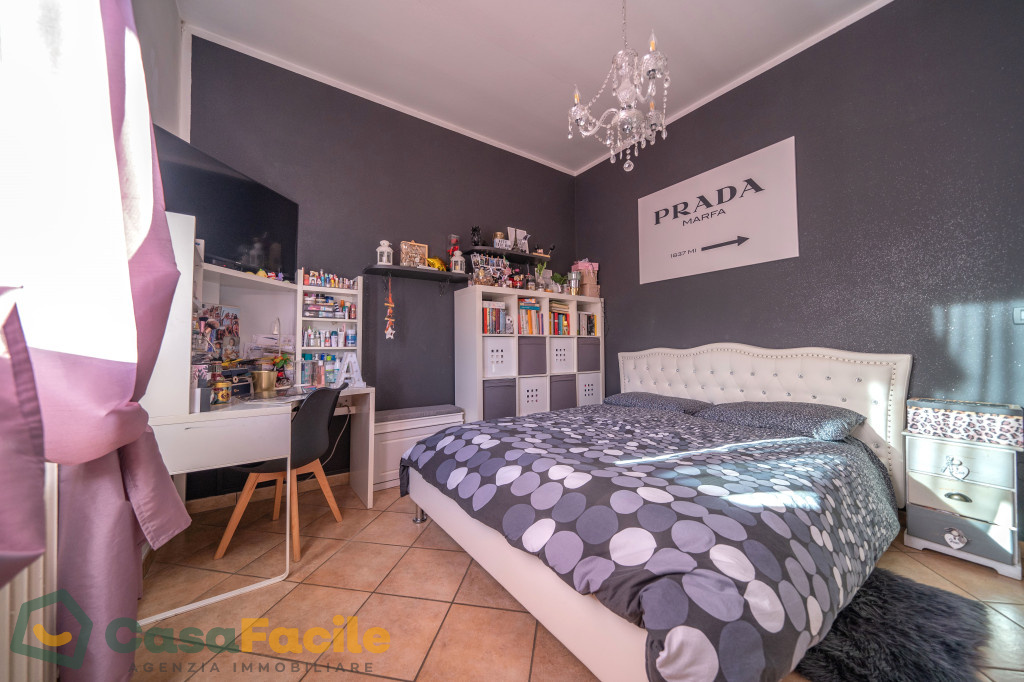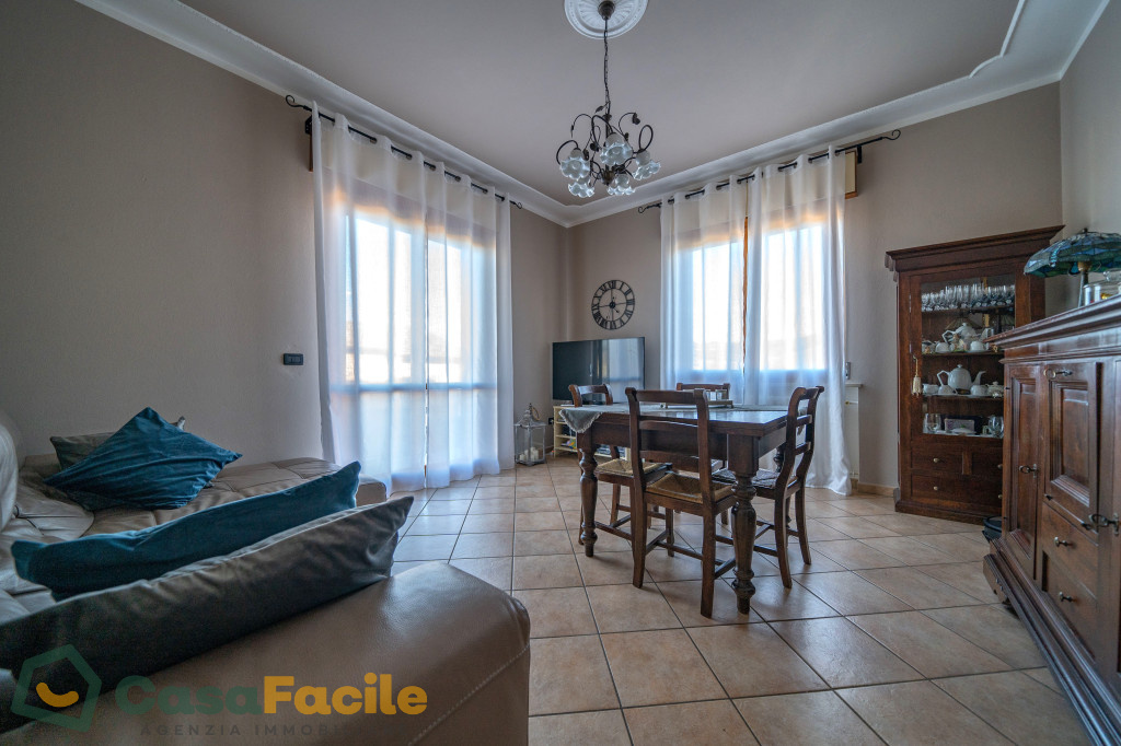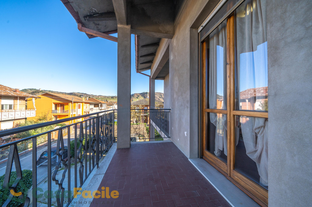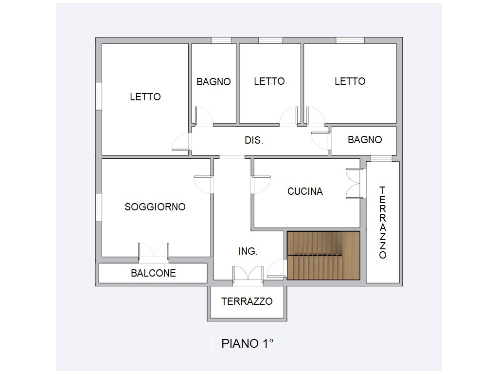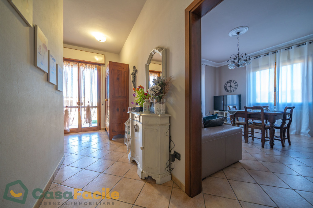 Gli ambienti sono così disposti: ingresso, soggiorno con balcone, cucina abitabile con terrazzo, disimpegno, tre camere da letto di cui due matrimoniali e una singola, due bagni finestrati e un ulteriore terrazzo accessibile dall'ingresso.