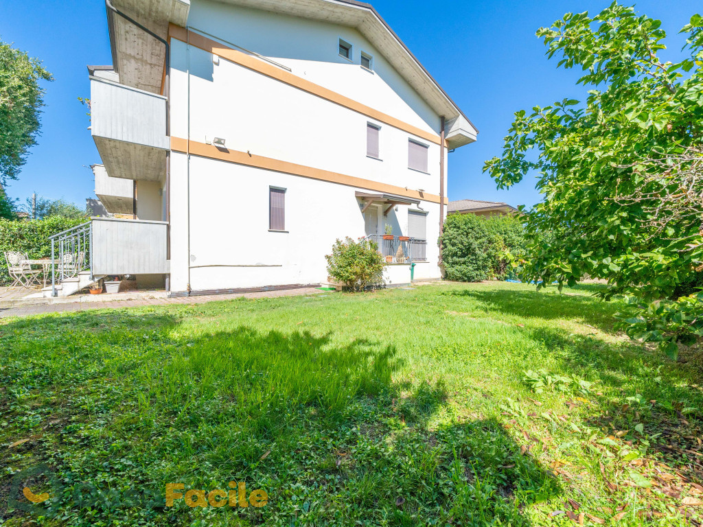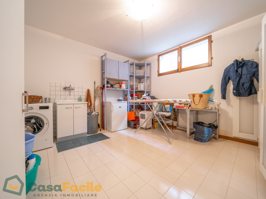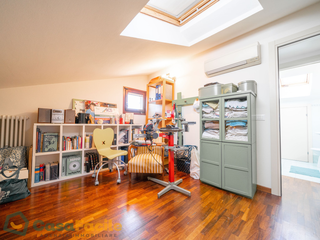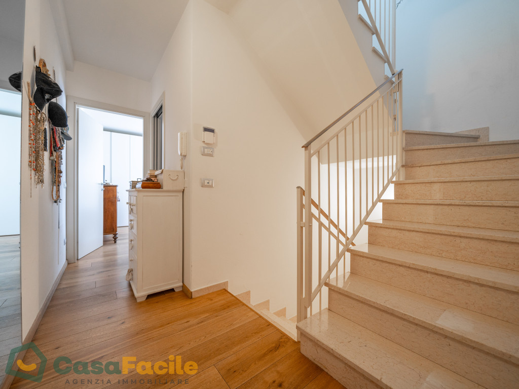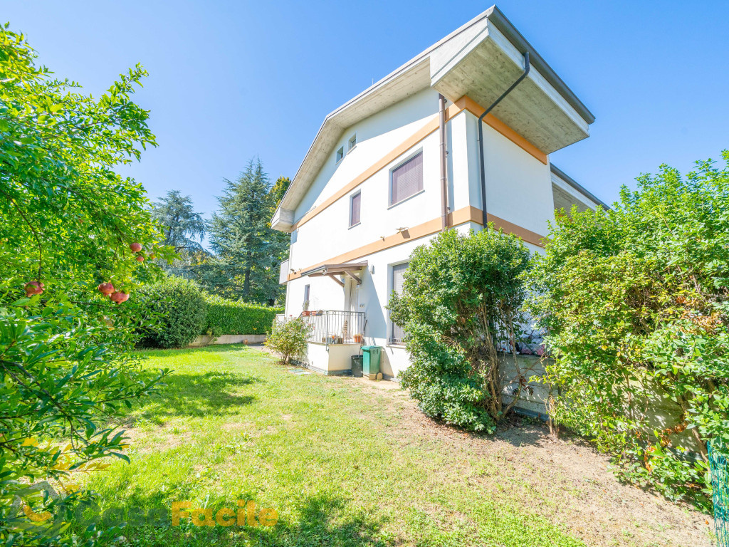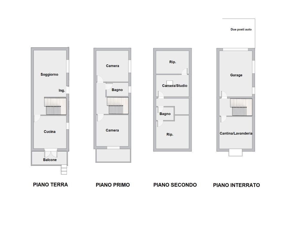 Al piano terra abbiamo l'ingresso indipendente su giardino, porta d'ingresso che affaccia su luminoso soggiorno con cucina abitabile che affaccia sul balcone sempre collegato al giardino. Al piano primo troviamo due camere da letto matrimoniali con balcone e bagno finestrato. La terza camera la troviamo al piano mansardato con il secondo bagno/lavanderia. Conclude la soluzione un ampia cantina al piano interrato collegata ad un garage da 21mq. con doppio posto auto coperto fronte garage.