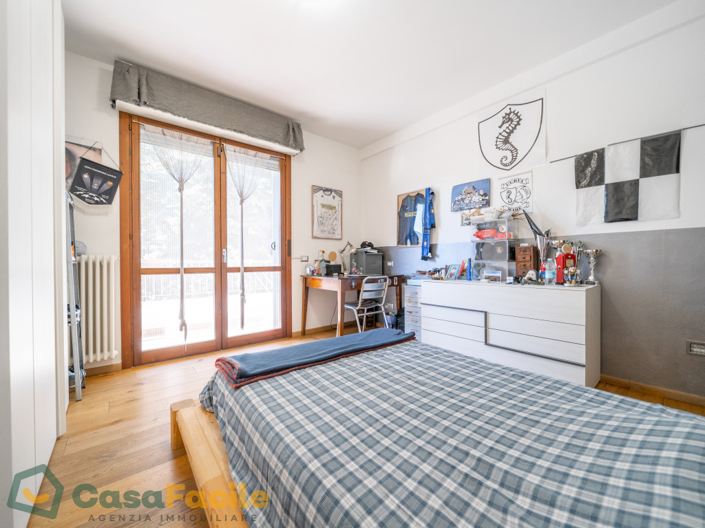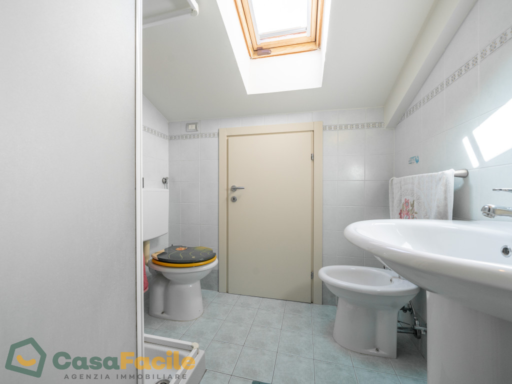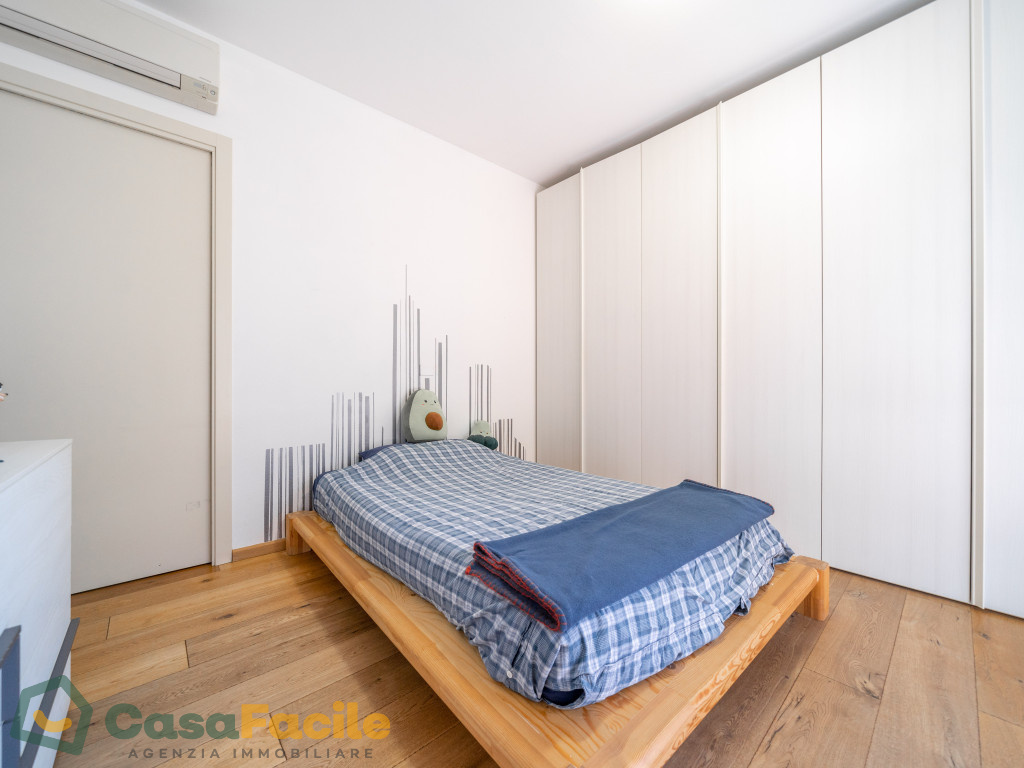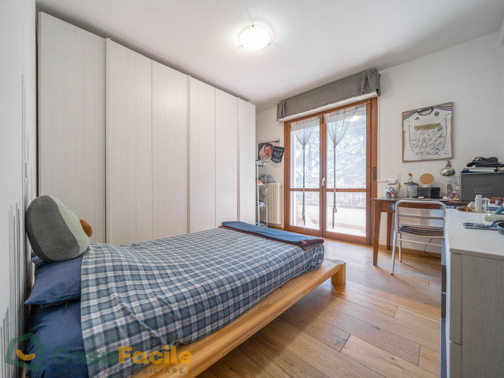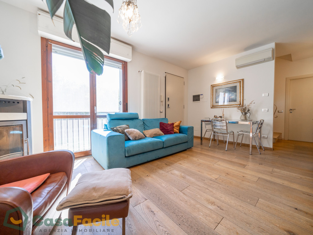 Al piano terra abbiamo l'ingresso indipendente su giardino, porta d'ingresso che affaccia su luminoso soggiorno con cucina abitabile che affaccia sul balcone sempre collegato al giardino. Al piano primo troviamo due camere da letto matrimoniali con balcone e bagno finestrato. La terza camera la troviamo al piano mansardato con il secondo bagno/lavanderia. Conclude la soluzione un ampia cantina al piano interrato collegata ad un garage da 21mq. con doppio posto auto coperto fronte garage.