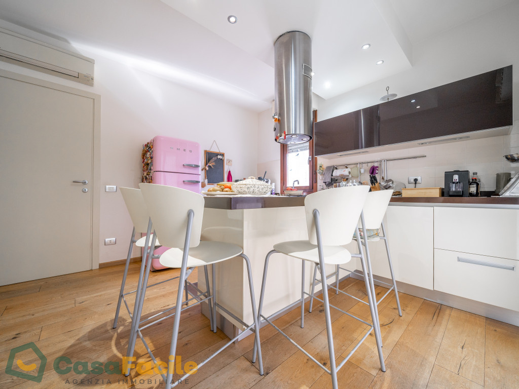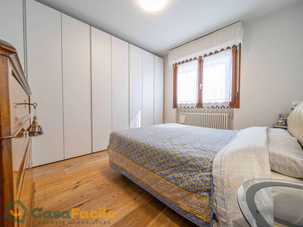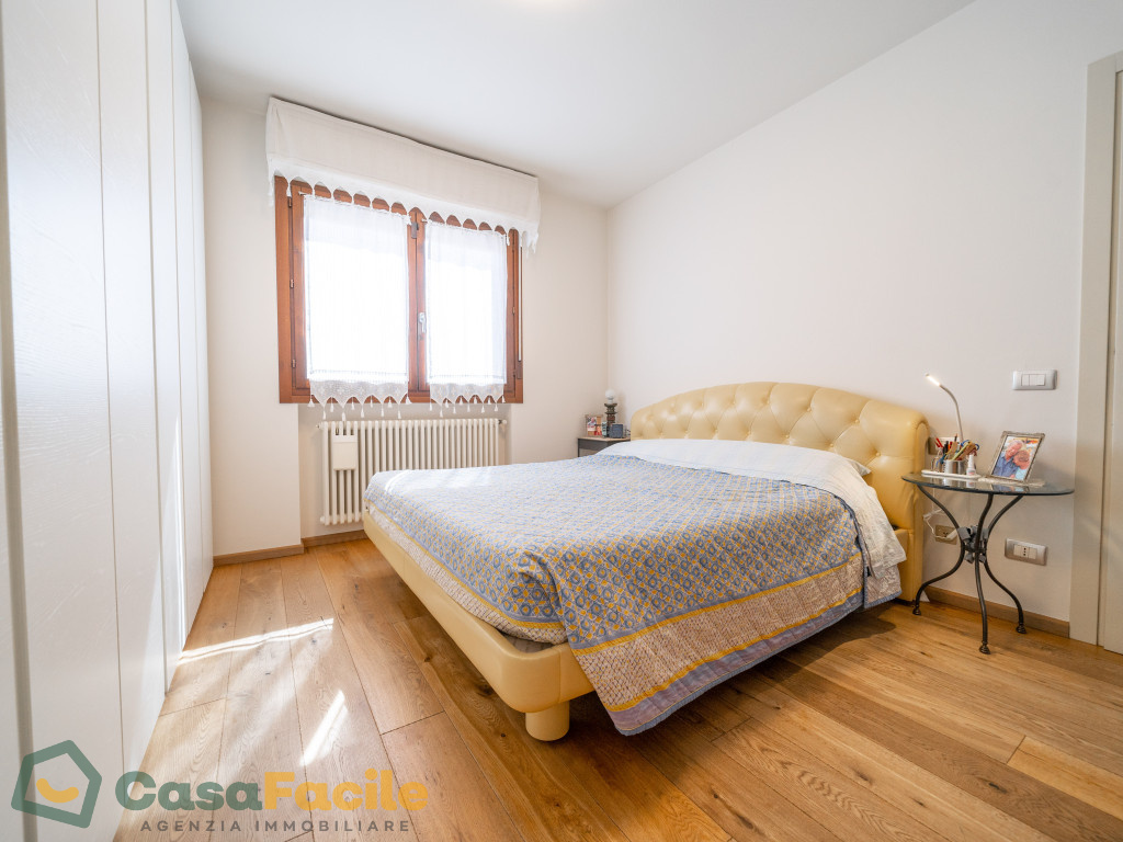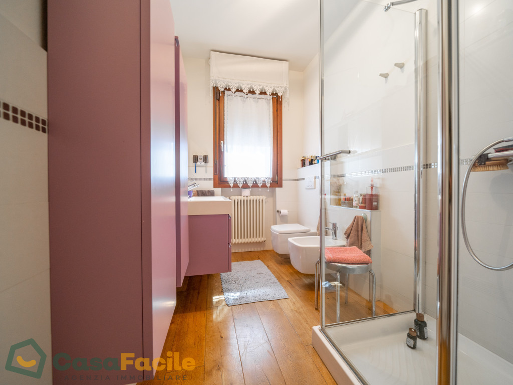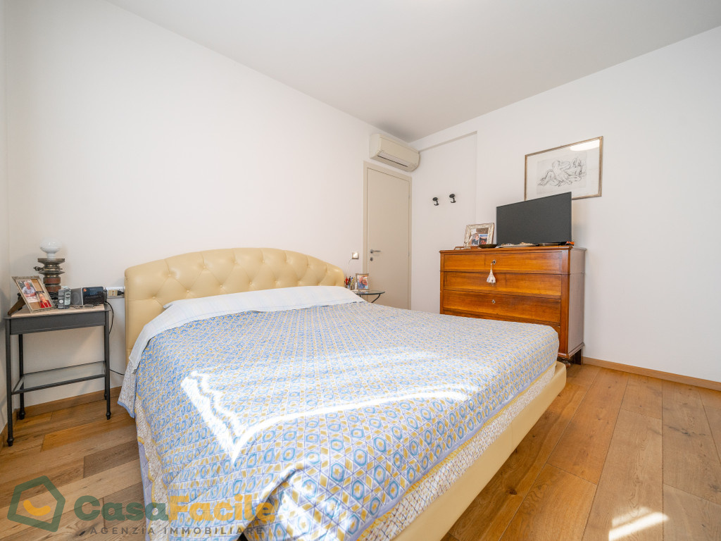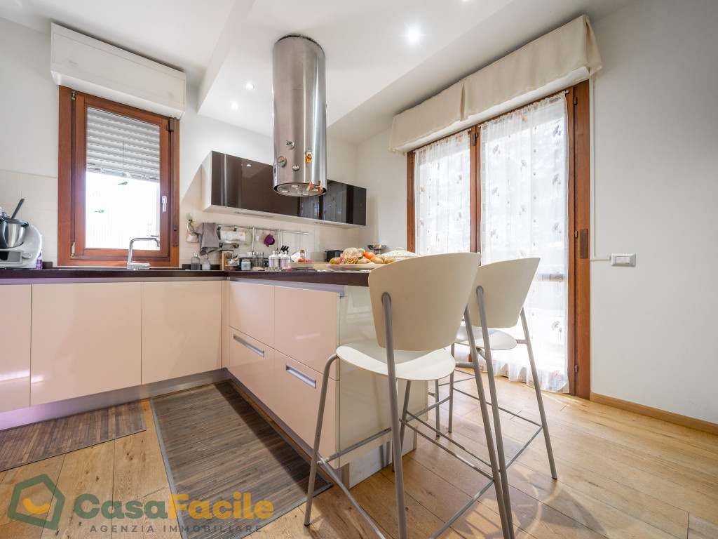 Al piano terra abbiamo l'ingresso indipendente su giardino, porta d'ingresso che affaccia su luminoso soggiorno con cucina abitabile che affaccia sul balcone sempre collegato al giardino. Al piano primo troviamo due camere da letto matrimoniali con balcone e bagno finestrato. La terza camera la troviamo al piano mansardato con il secondo bagno/lavanderia. Conclude la soluzione un ampia cantina al piano interrato collegata ad un garage da 21mq. con doppio posto auto coperto fronte garage.
